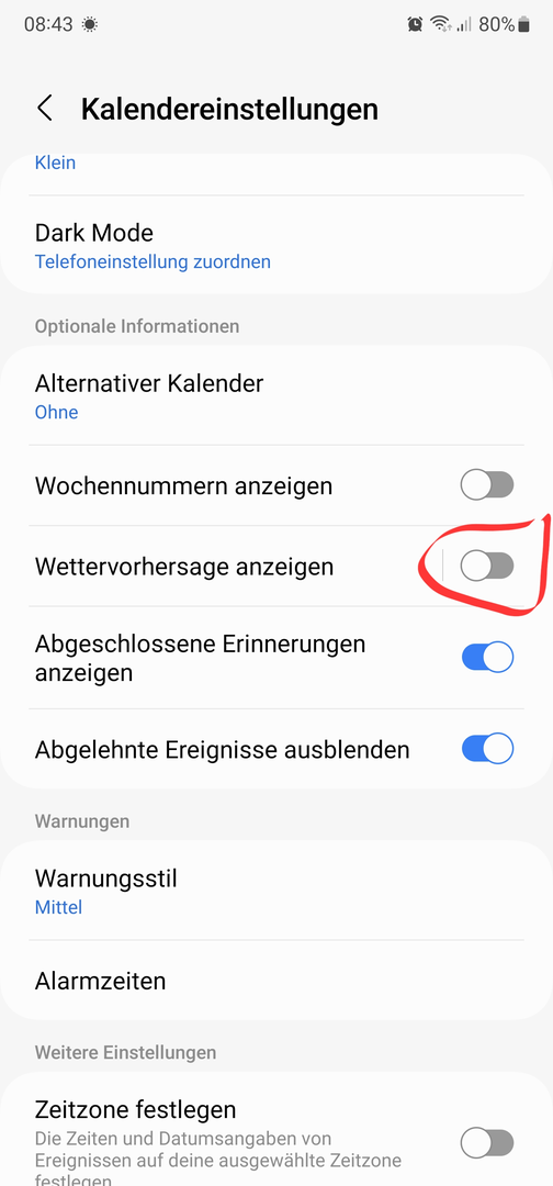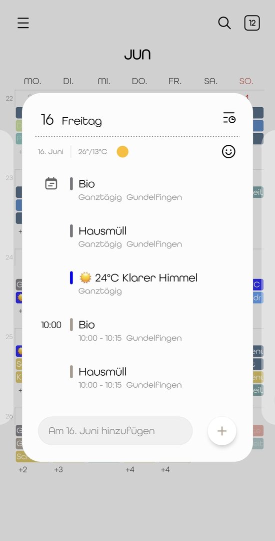 Sie können die Wettervorhersage über den Plus-Button in der Kalenderliste hinzufügen. Derzeit gibt es einen Fehler, der dazu führt, dass auch außerhalb der USA Fahrenheit vorausgewählt wird, bitte wählen Sie manuell metrisch im 3-Punkte-Menü des Wettereintrags in der Kalenderliste.