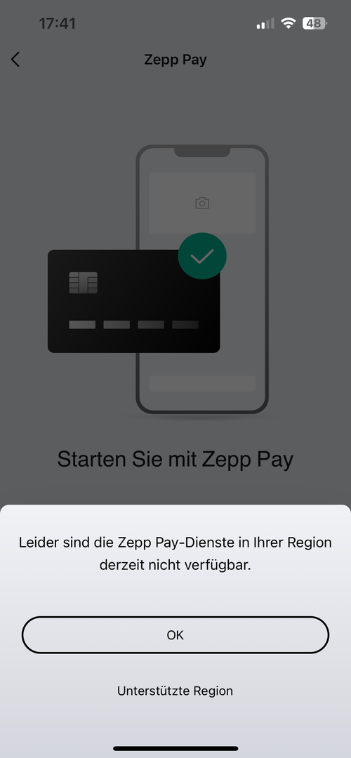Und Zepp Pay ist momentan wohl nur in Europa verfügbar. Wenn man Zepp Pay hinzufügen möchte, kommt eine Fehlermeldung und man kann auf die verfügbaren Regionen schauen --> siehe Bilder.