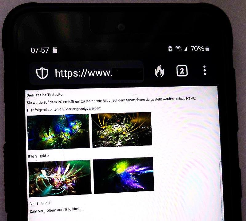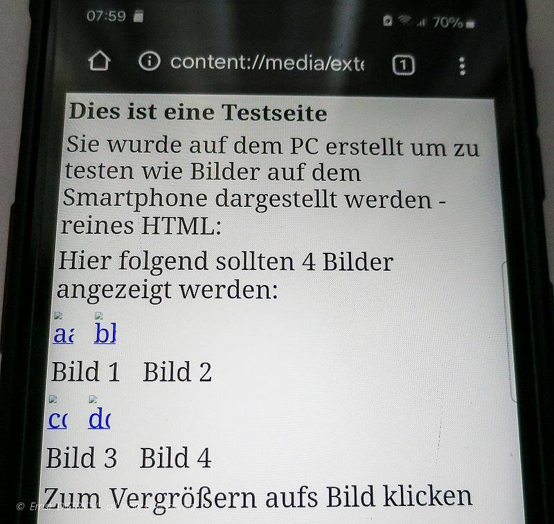 Den selben Ordner (per Kabel) aufs Handy (SD-Karte) übertragen und die index.html gestartet - seite offline.jpg - statt der Bilder werden kleine Symbole und ein Link angezeigt.