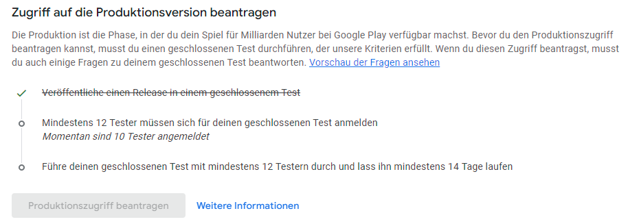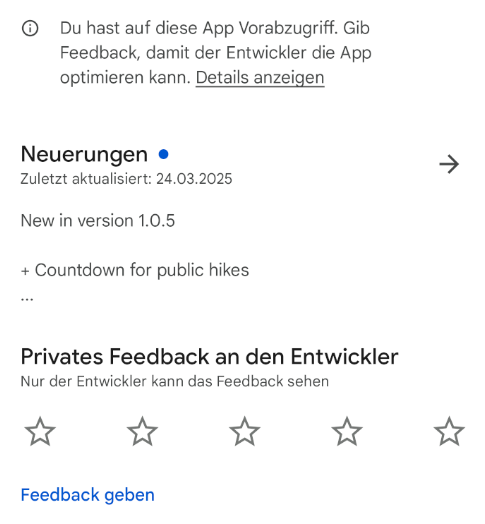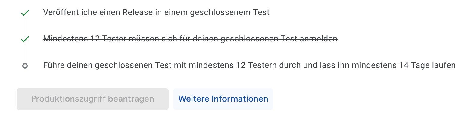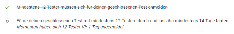 um meine App „Deichwandern“ im Google Play Store veröffentlichen zu können, brauche ich mindestens 12 aktive Tester, die über 14 Tage ab und zu die App testen. Aktuell habe ich erst zwei – da liegt noch etwas Weg vor mir!