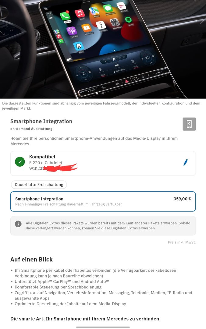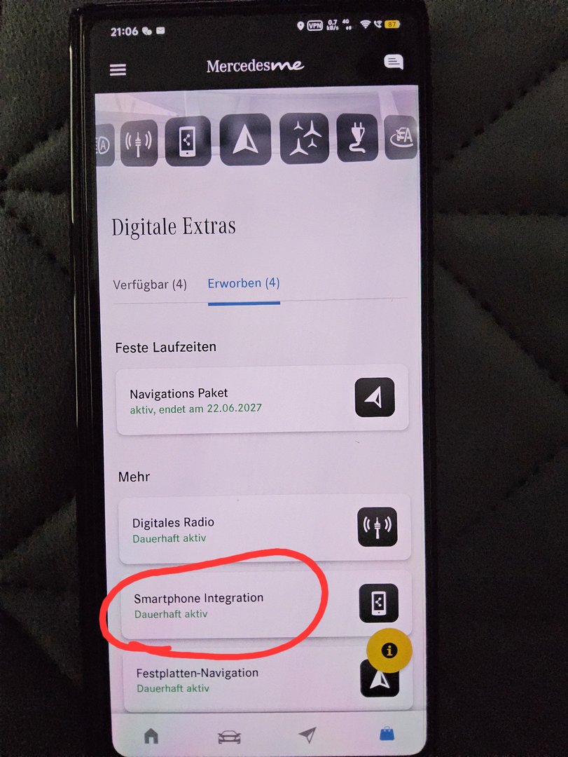 Es wird mir noch die Anbindung über Bluetooth angeboten, da geht gleichfalls nix. Hier soll ich das Smartphone mit dem Auto verbinden. Es ist jedoch mit dem Auto verbunden, ich telefoniere über das Auto und es läuft Mercedes Me (so eine App, mit der man das Auto auslesen und einiges eingstellen kann). Gestern hat das Auto damit ein System-Update über das Smartphone runtergeladen.