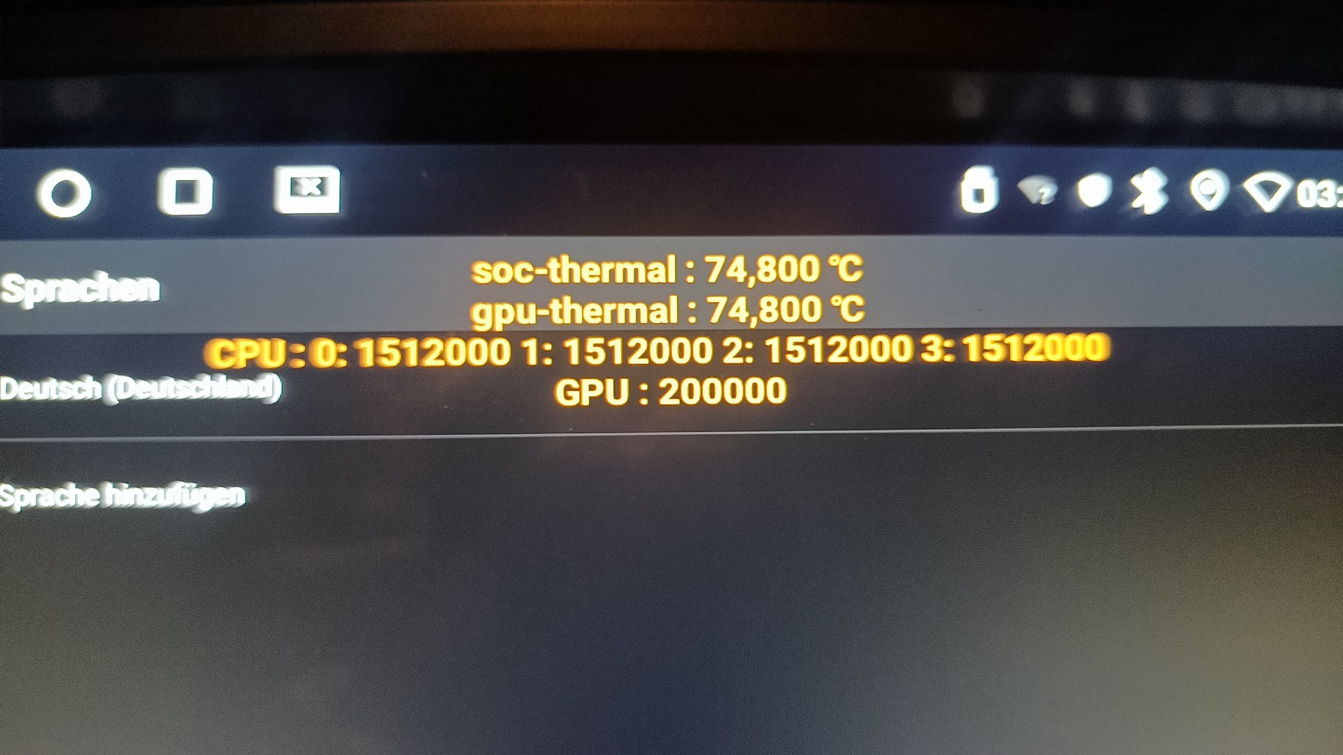 erscheint jetzt kurz nach dem Start ein gelber Text auf dem Display wo mir Temperatur der CPU Kerne angezeigt wird sowie die 4 CPU selbst siehe Bild keine Ahnung wie es dazu kam will zumindest nicht weg Werkseinstellungen zurück setzen funktioniert auch nicht um das weg zu Bekommen Support schon angeschrieben aber hab noch keine Antwort hat wer ne Ahnung was ich machen kann ?