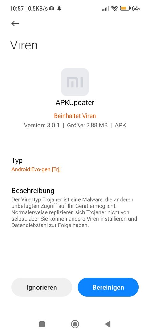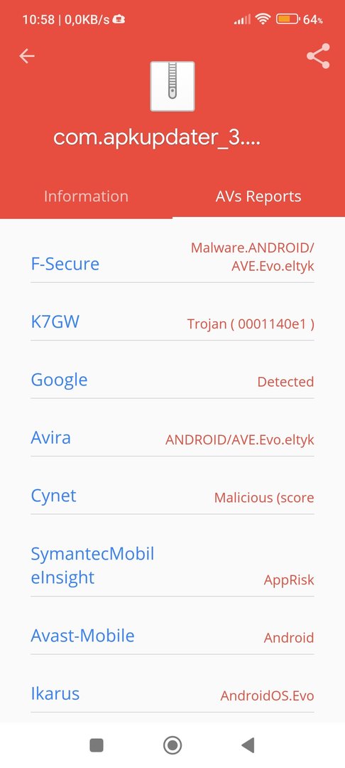 Den APK Updater nutze ich schon länger, aber ab Version 3.0 werden Viren gemeldet. Ich halte es für einen Fehlalarm. Es ist egal, ob die APK oder der Updater bei Aktualisierung von 2.5 nach 3 gescannt wird. Google Play Protect meldet nichts, aber die Sicherheits App mit Avast Signaturen und einige Scanner bei Virustotal.
