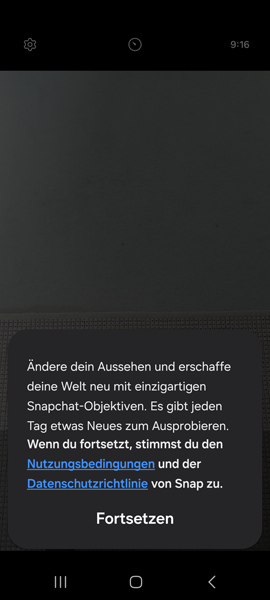 Ich habe ein Handy mit vorinstalliertem "Fun" Modus. Bin aus Versehen auf "Fortsetzen" ("Stimme Bedingungen von Snap zu") und auf den Auslöser gekommen.