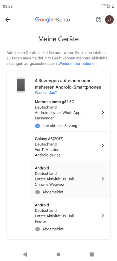 Ich war leider nicht geistesgegenwärtig genug vorher einen screenshot zu machen; es war aber tatsächlich so, dass ich, mit meinem Handy in der Hand (moto g82 5g) gelesen habe, meine aktuelle Sitzung fände mit diesem mir unbekannten "android device" statt. Abgesehen davon ist ausgeschlossen, dass eines unserer Geräte im Haushalt damit gemeint ist. Leider kann ich aber nicht ausschließen, dass jemand Interesse daran hat, in meinen Daten rumzuwühlen (Nachbarschaftsgeschichte); ich hatte vorher schon mal den Verdacht und hab daraufhin den WLAN-Schlüssel geändert, was nicht viel gebracht hat.
