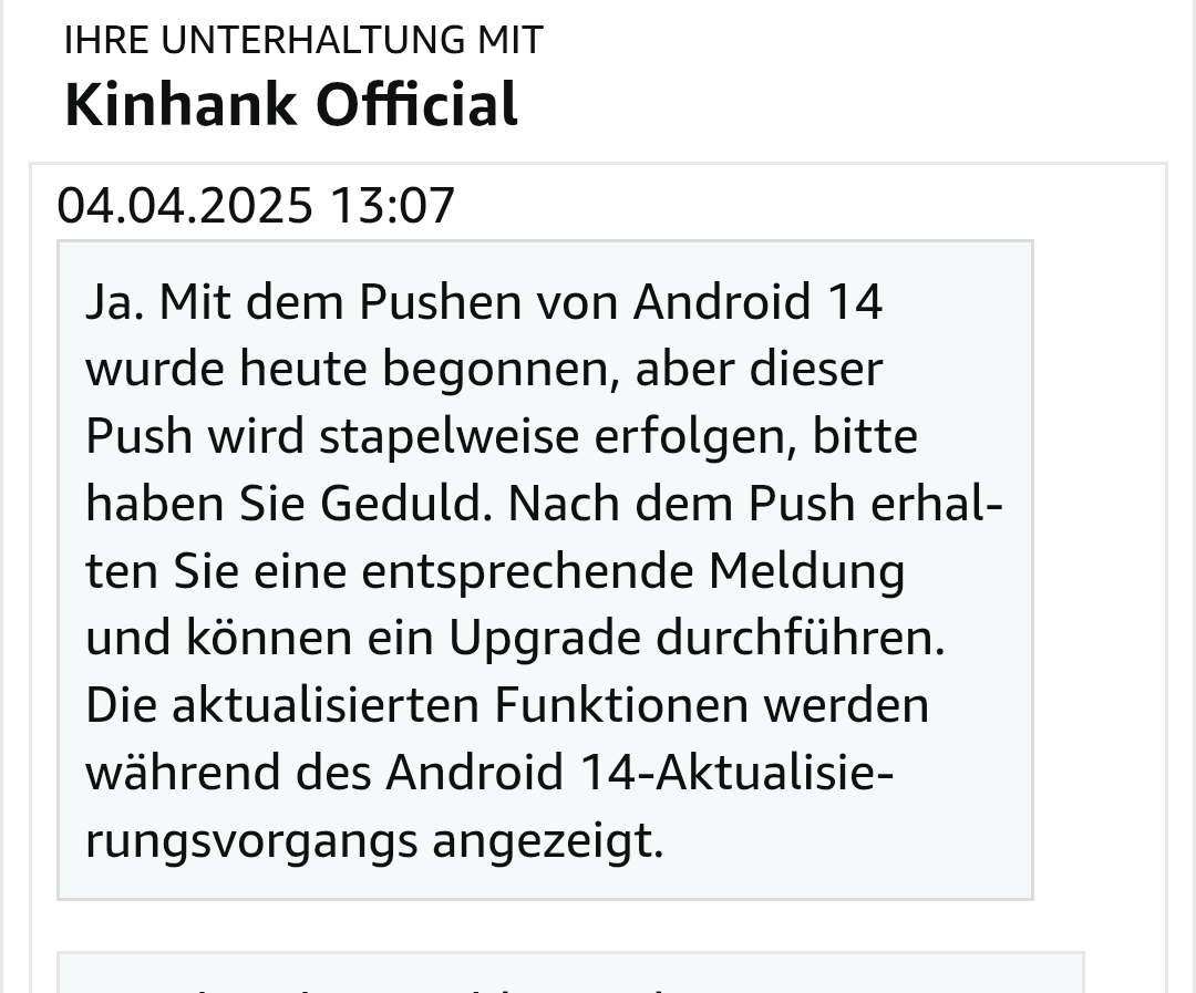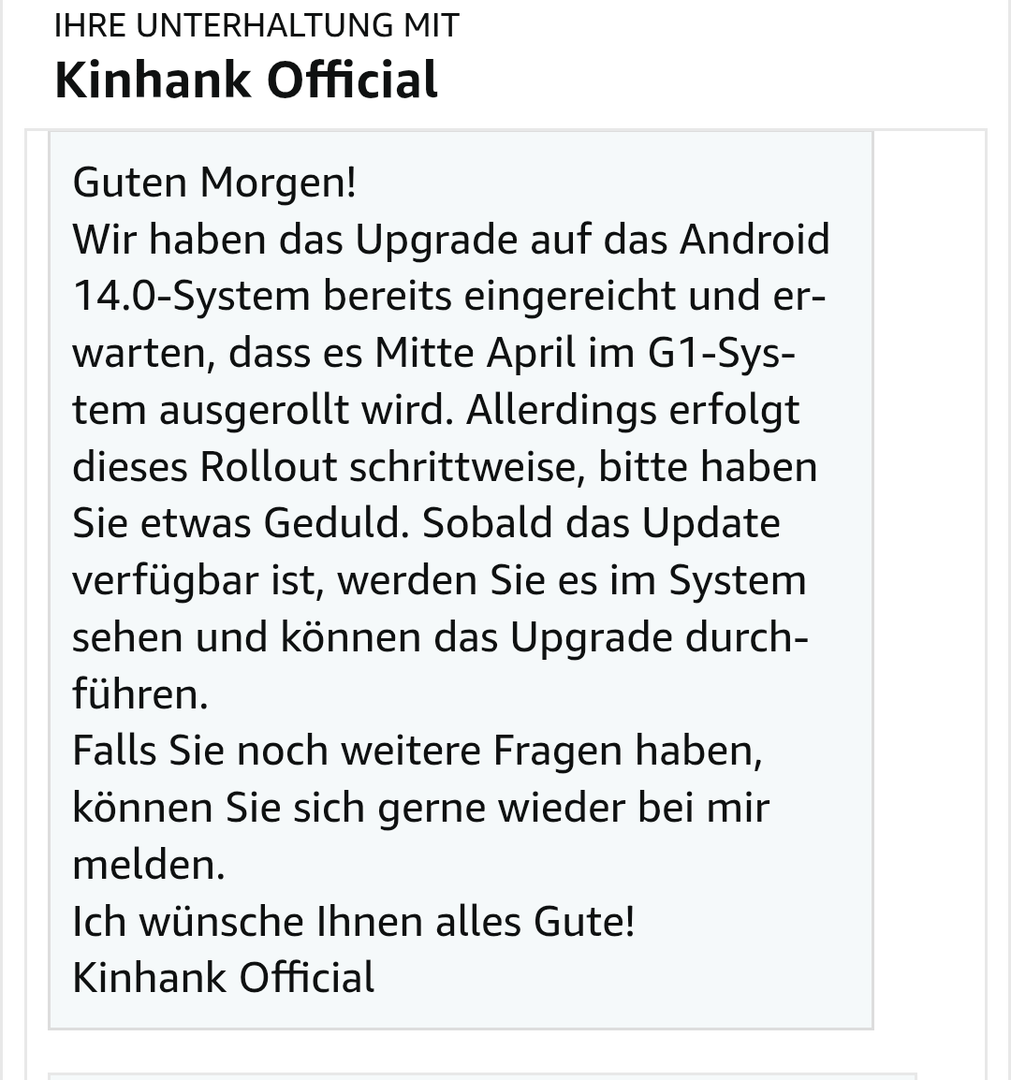 Guten Morgen!Wir haben das Upgrade auf das Android 14.0-System bereits eingereicht und erwarten, dass es Mitte April im G1-System ausgerollt wird. Allerdings erfolgt dieses Rollout schrittweise, bitte haben Sie etwas Geduld. Sobald das Update verfügbar ist, werden Sie es im System sehen und können das Upgrade durchführen.Falls Sie noch weitere Fragen haben, können Sie sich gerne wieder bei mir melden.Ich wünsche Ihnen alles Gute!Kinhank Official