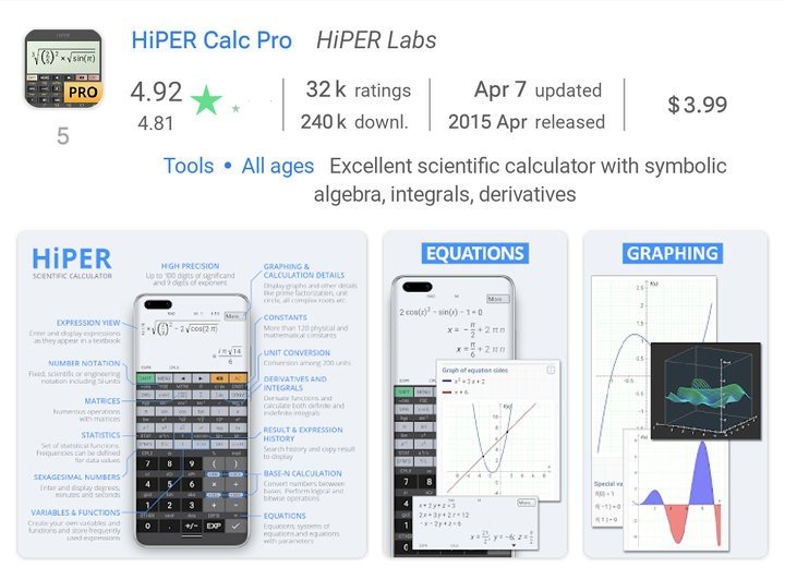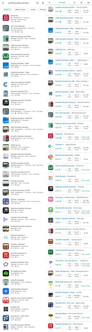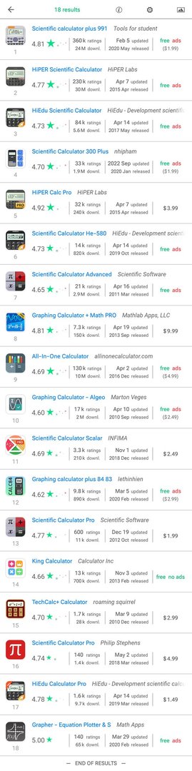 (Es gibt mehrere andere gute fortgeschrittene Rechner-Apps, die jedoch von den Entwicklern nicht als scientific graphing calculator bezeichnet werden, und daher nicht erwartet werden kann, dass sie mit der obigen Anfrage zurückgegeben werden).