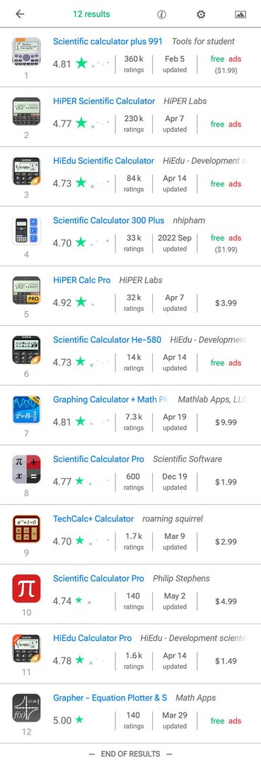 (Wir könnten die Suche noch weiter verfeinern, indem wir auch die Wörter scientific oder graphing im Titel oder in der Zusammenfassung verlangten, indem wir +scientific/graphing zur Anfrage hinzufügten, was 2 weitere irrelevante Apps entfernen würde).
