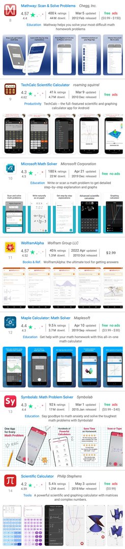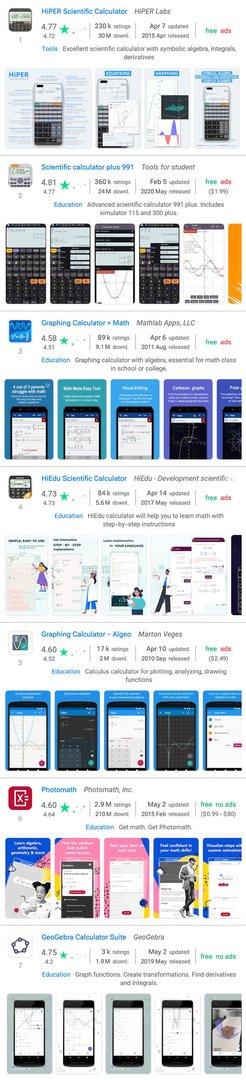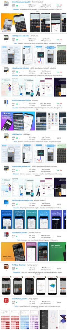 Da die Begriffe wissenschaftlicher Taschenrechner und grafischer Taschenrechner (scientific calculator und graphing calculator auf Englisch) allgemein gebräuchlich sind, würden wir erwarten dass jede derartige App diese Begriffe in der Beschreibung enthält. Nicht unbedingt die beiden exakten Ausdrücke, aber Formen der Wörter scientific, graphing, und calculator (vielleicht so etwas wie scientific calculations, und graphs of functions).