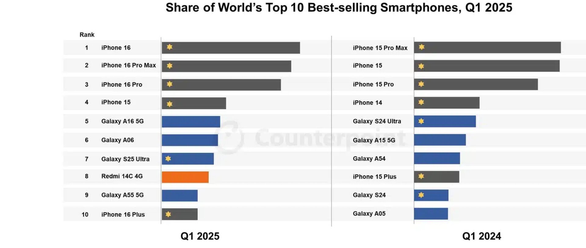 Das 60 Hz Apple iPhone 16 sichert sich wie schon in Q4 2024 den ersten Platz vor dem iPhone 16 Pro Max und Pro.