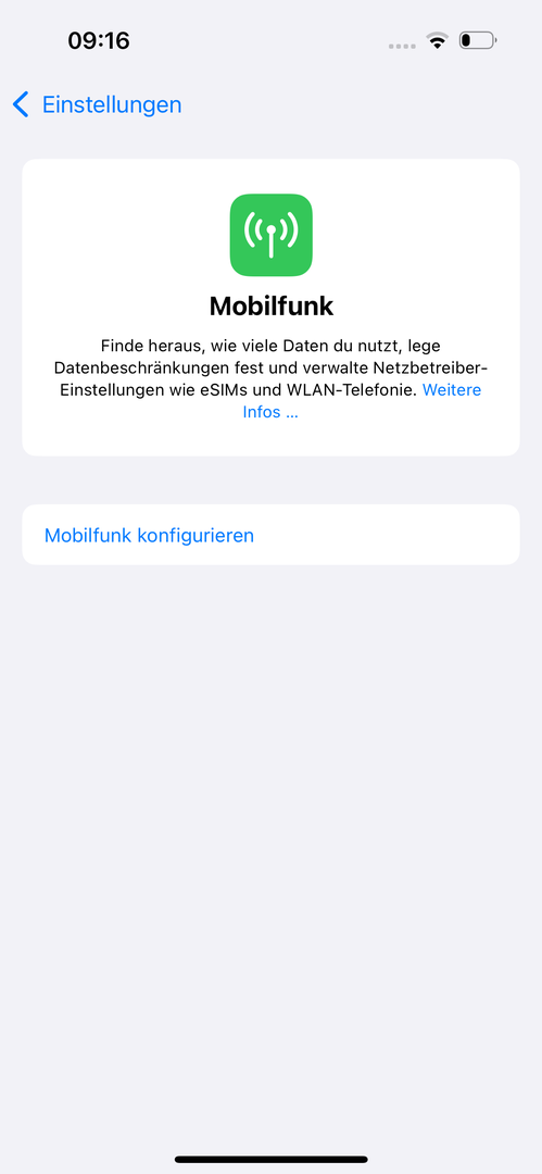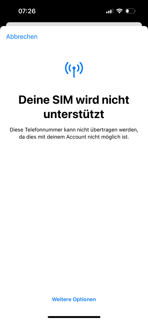 Leider kann ich aber meine eSim nicht hinzufügen bzw übertragen. Sobald ich in den Mobilfunk Einstellungen auf „Mobilfunk konfigurieren“ klicke, kommt die Meldung „Deine SIM wird nicht unterstützt“