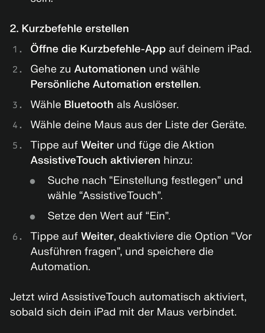Zur Maus. Auch nicht, wenn sie gekoppelt ist und somit erkannt wird? Aber ich gehe voraus, dass du das im Vorfeld eingerichtet hast. Ich habe weder iPad noch Maus, sonst könnte ich selbst daran herum tüfteln. Wenn ich mal Zeit habe und zufälligerweise eine Lösung finden sollte, melde ich mich hier gerne zurück. Sonst weiterhin viel Glück.dtp schrieb:So, leider scheitert die obige Anleitung schon daran, dass mir unter den Bluetooth-Geräten die MX Master 3 gar nicht als Option angeboten wird.
