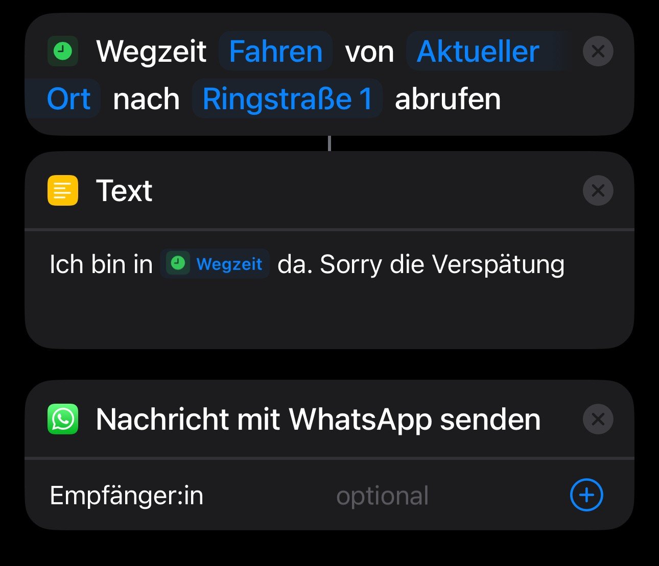 - Kurzbefehl für die Zeit, die man von seinem aktuellen Standort zu einer bestimmten Adresse benötigt. Nur als Beispiel, falls man etwa KollegInnen informieren möchte, wenn man zu spät in die Arbeit kommt. Zieladresse ist natürlich anzupassen, Empfänger einzutragen.
