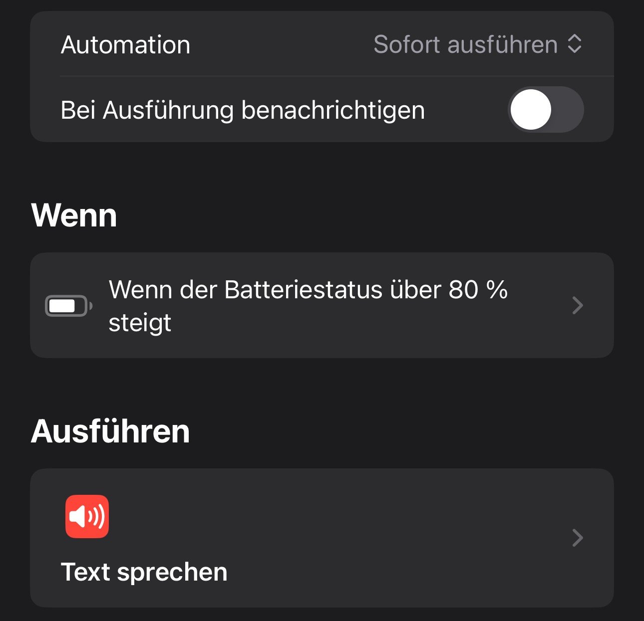 - dann noch eine Automation: Ich habe das Charge Limit zwar nicht auf 80% gesetzt, möchte aber informiert werden, wenn dieses erreicht bzw. überschritten wird. Unter Text braucht man dann nur eintragen, was man hören möchte, zB "eighty percent"