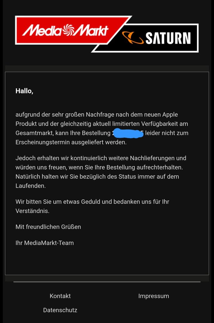 Habe bei Mediamarkt bestellt und habe heute eine Email bekommen das es zur Lieferverzögerung kommt, was ich nicht verstehe habe bei einem anderen Forum gelesen das jemand es vorgestern bestellt hat und es morgen ankommt, hatte es direkt um 14 Uhr bestellt am Freitag und ich bekomme Lieferverzögerung. Macht für mich null Sinn