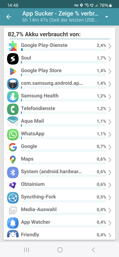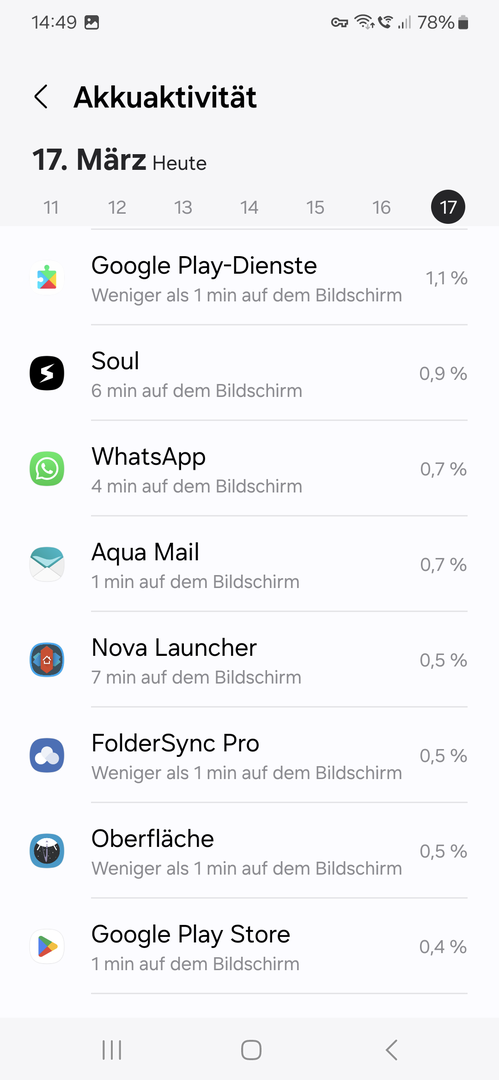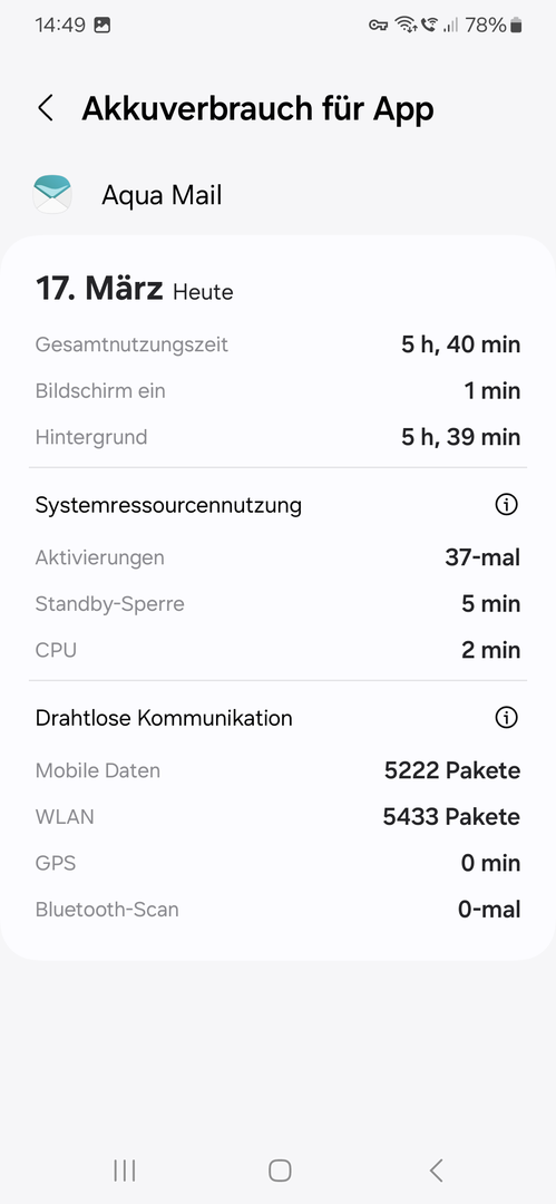 - Dein Screenshot zeigen die Einstellungen für ein Konto, nicht die allgemeinen Einstellungen zur Synchronisation. Diese Einstellungen für ein Konto sollten nur in dem Fall verwendet werden, falls sie von den normalen Einstellungen in der App abweichen sollen. Prüfe, ob das wirklich so ist. Denn wenn jedes Konto unterschiedlich abfragt und synchronisiert, ist natürlich AquaMail mehr oder weniger die ganze Zeit am Rödeln. Das kann am Akku ziehen.
