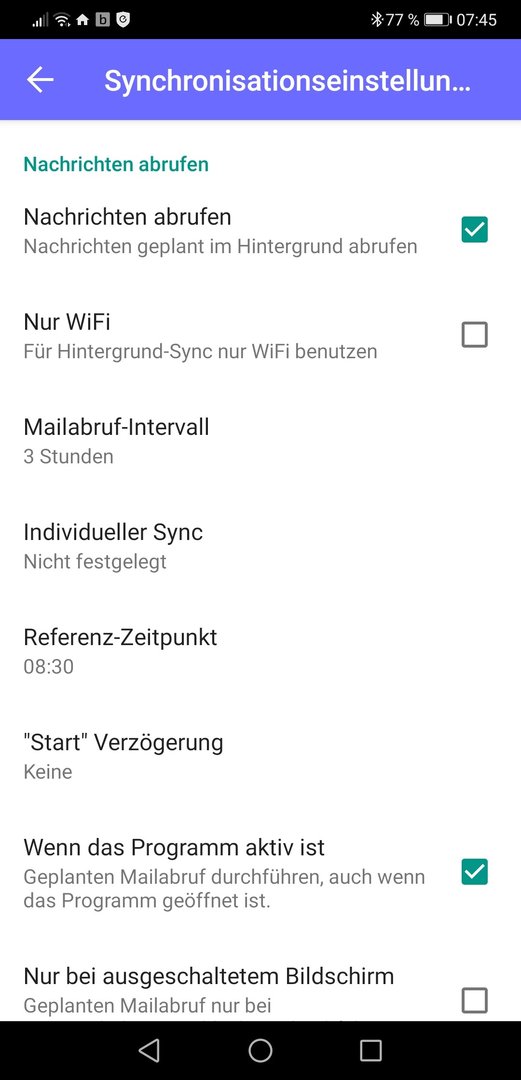 Bei den für mich 2 relevanten Konten soll nun nicht mehr 24h im Hintergrund synchronisiert werden sondern nur noch 1, maximal 2 mal am Tag (wenn möglich am besten zu bestimmten Zeiten). Die Nachrichten sollten dann diese ein bis zwei Male ganz normal in der Smart Box landen und somit auch per Push bei mir auf dem Handy.