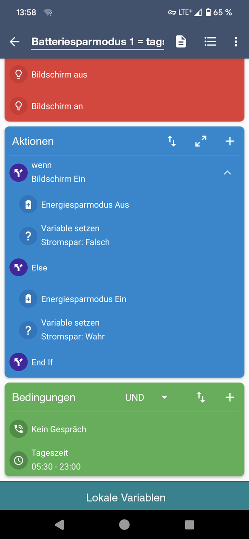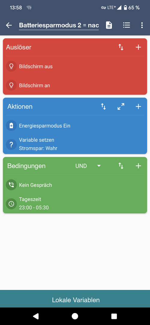 mit den beiden angehängten Makros steuere ich den Energiesparmodus tagsüber und nachts mit meinem Google Pixel 7 Pro. Mithilfe des ADB-Hack habe ich das auch ins Laufen gebracht. Im den Einstellungen habe ich im Energiesparmodus "Extrem-Energiesparmodus" den Wert "Jedes Mal fragen" aktiviert.