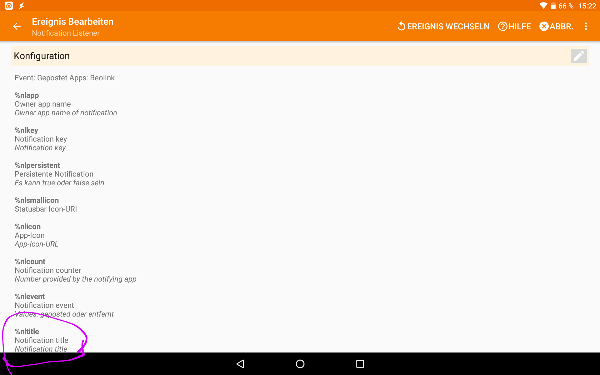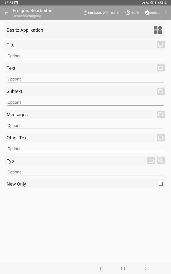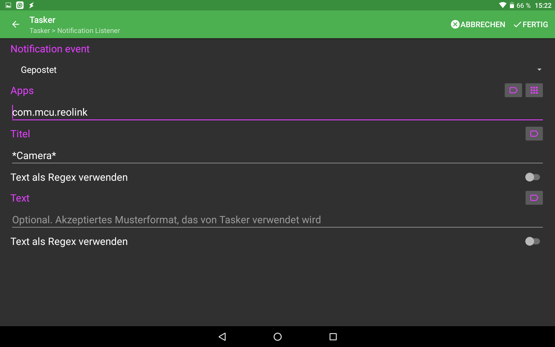 Ich möchte nur, dass eine Push-Benachrichtigung Aktionen auslöst. Dazu habe ich Notification Listener installiert und ein Profil in Tasker angelegt mit dem Ereignis - Plugin - Notification Listener