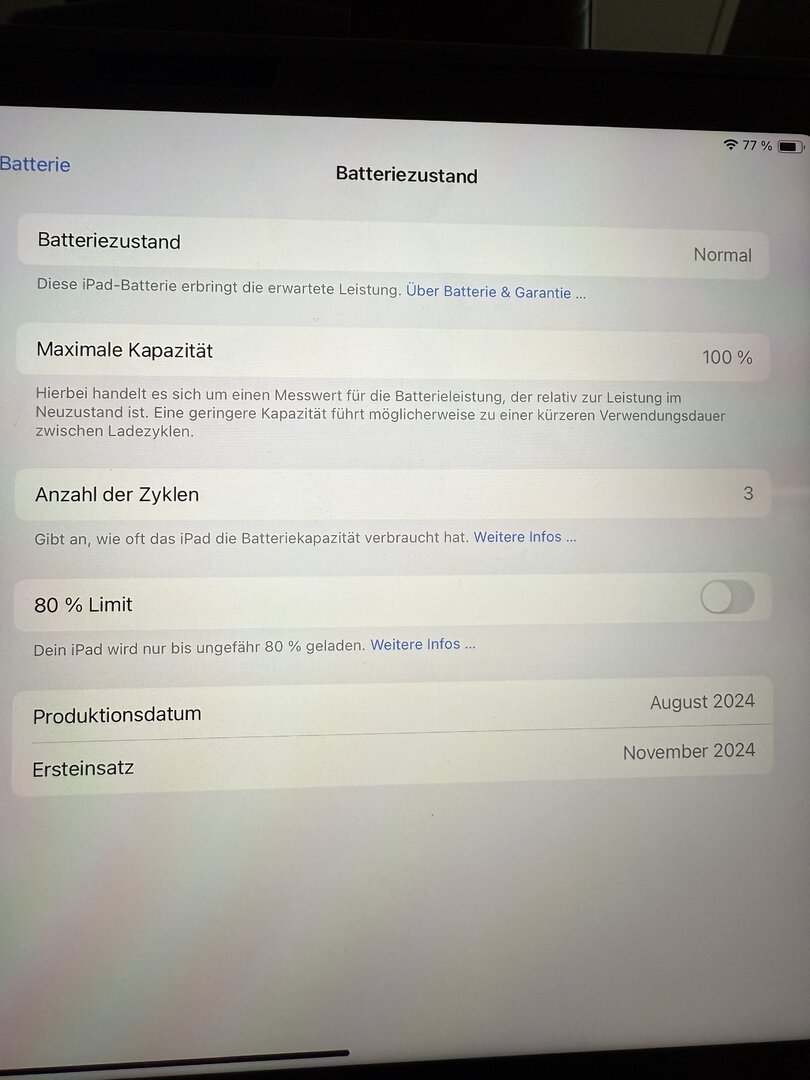 Akku Kapazität bei 100% bei 3 Lade Zyklen.
