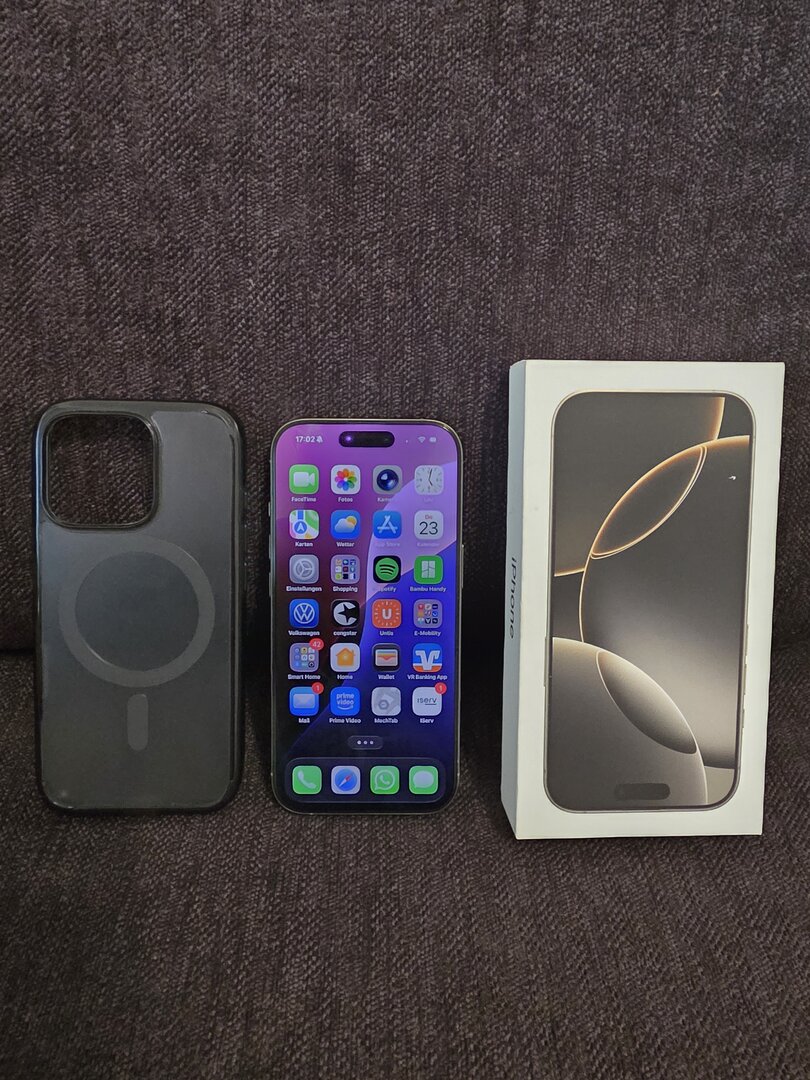 Biete hier ein makelloses Apple iPhone 16 Pro 256 GB in der Farbe Titan Natur mit Rechnung von MM vom 14.06.2025. Gerät trägt ein Panzerglas und eine Spigen Schutzhülle, die ich mitgebe. Eine Abholung oder ein Versand sind möglich. Akkukapazität liegt bei vollen 100%. Auf dem Display ist von Anfang an ein Panzerglas von Spigen.