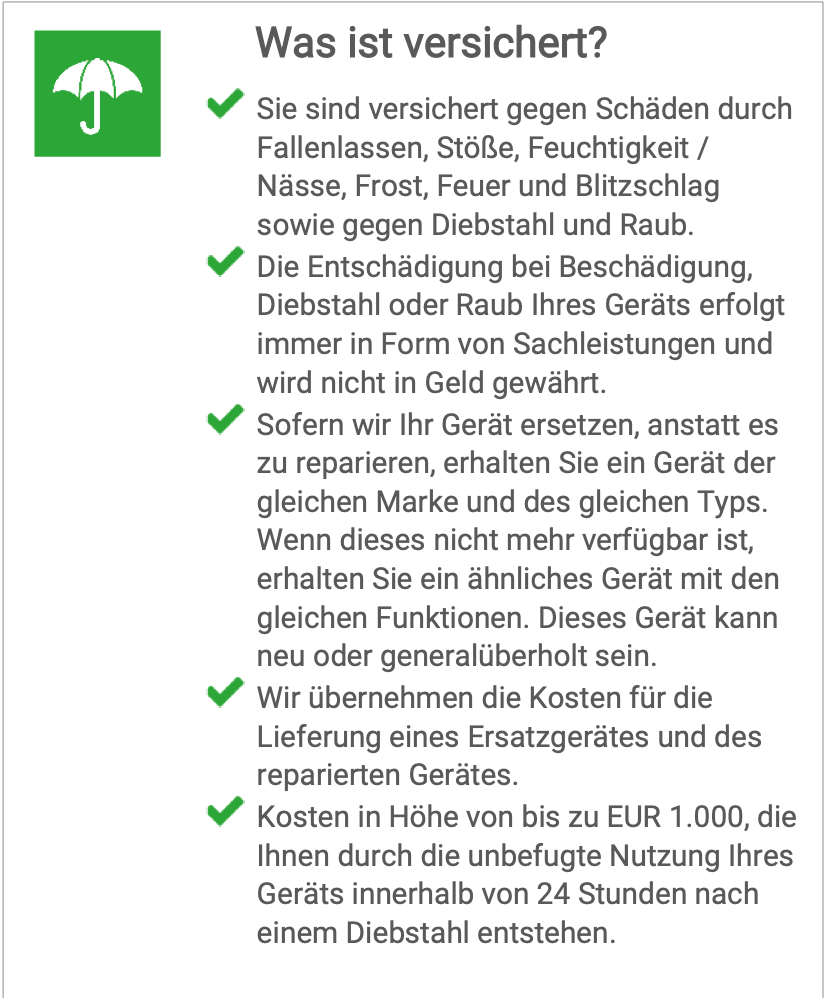 Über gomibo.de habe ich noch die Tulip Assist Mobile Complete Versicherung abgeschlossen, kostet monatlich 14,45 Euro, könnte nach Absprache weiter laufen, kosten müssten dann allerdings übernommen werden.