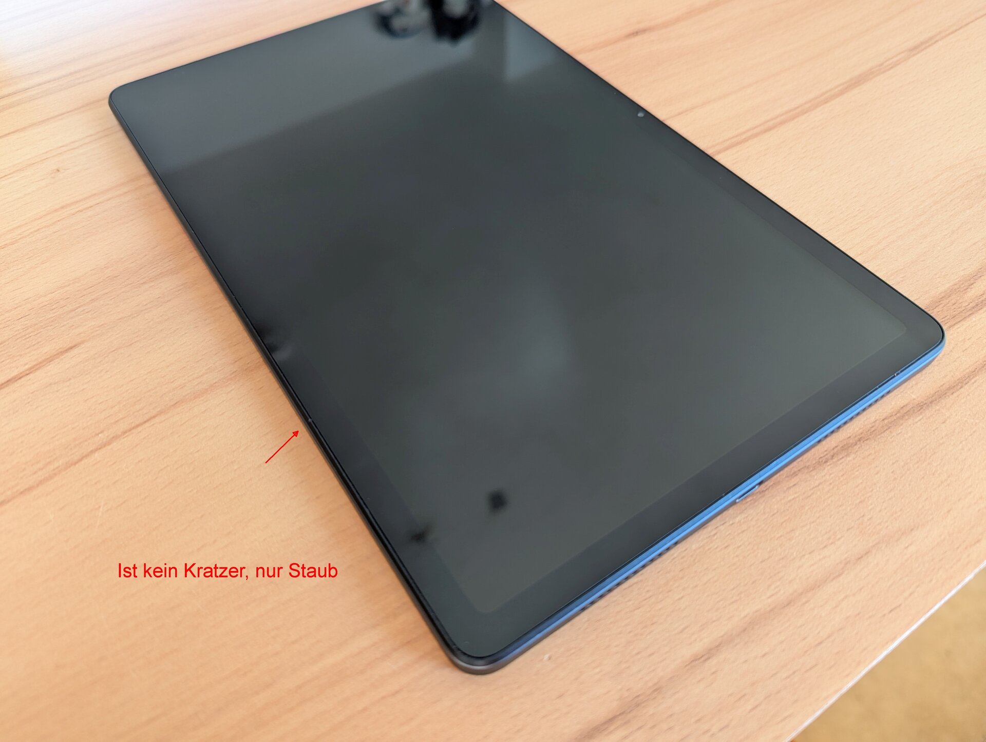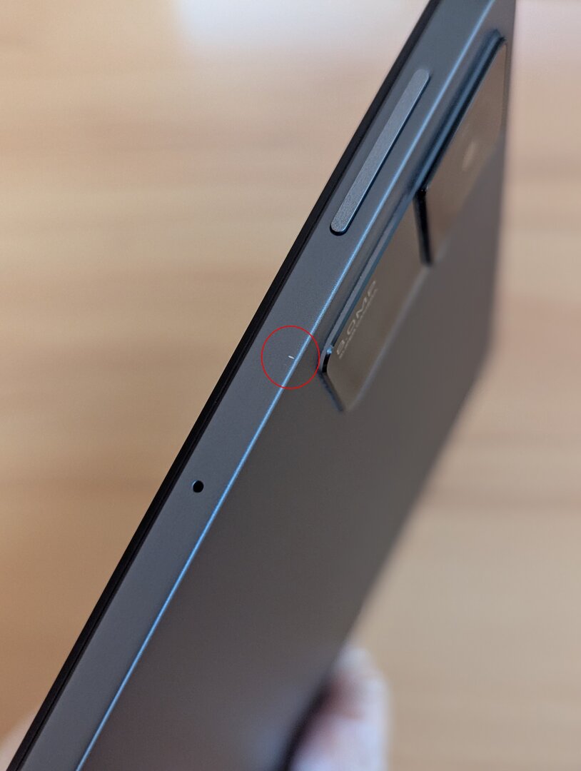 Der optische Zustand des Pads: Sehr gut. Es gibt eine kleine Abschürfung/Kratzer (1,5mm ca.) etwas unterhalb der Lautstärkewippe. Ich habe versucht, das auf Foto festzuhalten. Alles andere sind Staub und Fussel auf den Fotos. Ich dachte erst, am Displayrahmen wäre noch eine Abschürfung, das war aber auch nur Staub und Fussel. Habe extra nochmal nachgesehen.