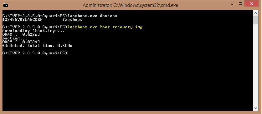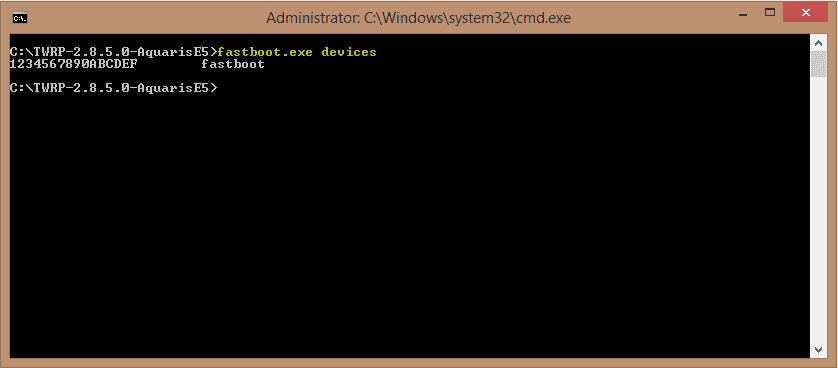 Nach installieren der Treiber und vebinden des Telefons (vorher in den Fastboot Modus gewechselt) passiert nicht viel beim ausfuehren der Install-TWRP.bat ausser der Anzeige "Waiting for device.