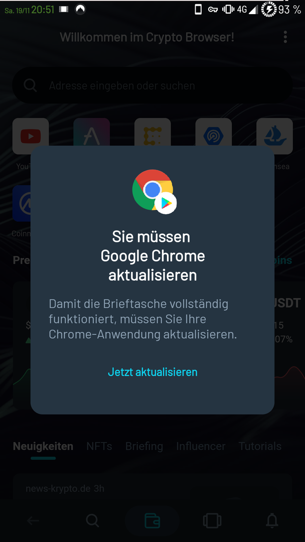 Auch der (Opera) Crypto Browser war für mich vor einiger Zeit (etwa 2 Monate her) nicht zu gebrauchen und mMn. echt schlecht. Mich interessiert aber Web3, worauf der Browser baut. Ich habe mir also eben den Browser erneut gezogen und wollte gucken was sich in der Zeit so getan hat. Ich wollte den Browser also öffnen, es klappt allerdings nicht. Es kommt eine Meldung, dass man "für die Brieftasche" eine Aktualisierung von Chrome braucht. Chrome habe ich nebenbei nicht mals auf dem Handy gehabt, aber eben die neuste Version heruntergeladen und eingerichtet. Nach wie vor kommt bei mir diese Meldung, dass ich doch Chrome aktualisieren soll, wenn ich den Crypto Browser öffne. Ich habe vor Neustart der App alle Daten davon gelöscht.