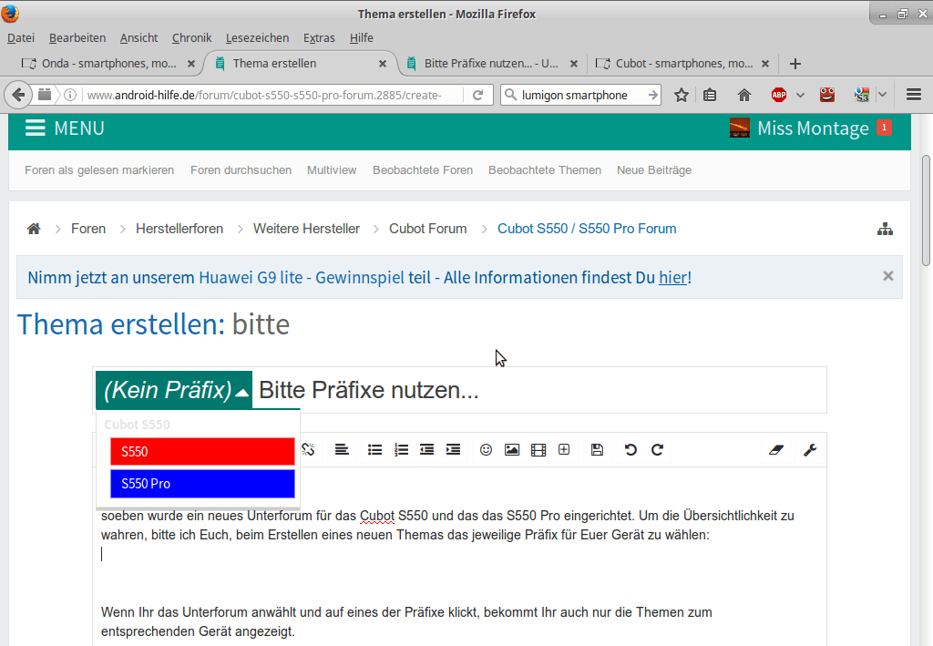 soeben wurde ein neues Unterforum für das Cubot S550 und das S550 Pro eingerichtet. Um die Übersichtlichkeit zu wahren, bitte ich Euch, beim Erstellen eines neuen Themas das jeweilige Präfix für Euer Gerät zu wählen: