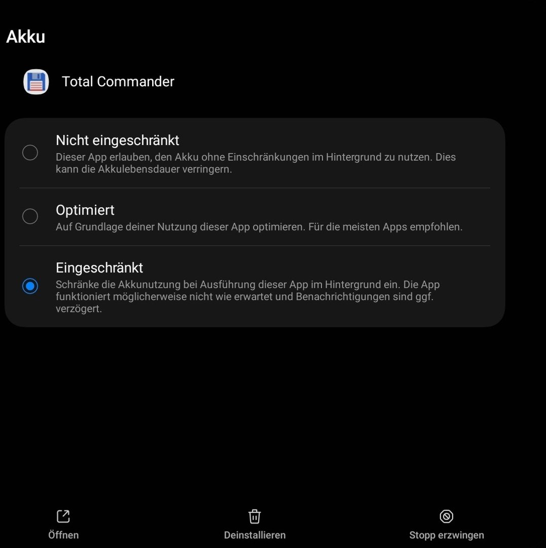Mit der o. g. Version des TotalCommander habe ich am Tab S6 Lite mit Android 13 (One UI 5.1.1) das Problem, dass es aktiv in der Liste der Apps mit Hintergrundaktivität gelistet bleibt und somit drastisch am Akku "nuckelt" (ca. 20% über Nacht), wenn es in den Akkueinstellungen der App auf "optimiert" steht.