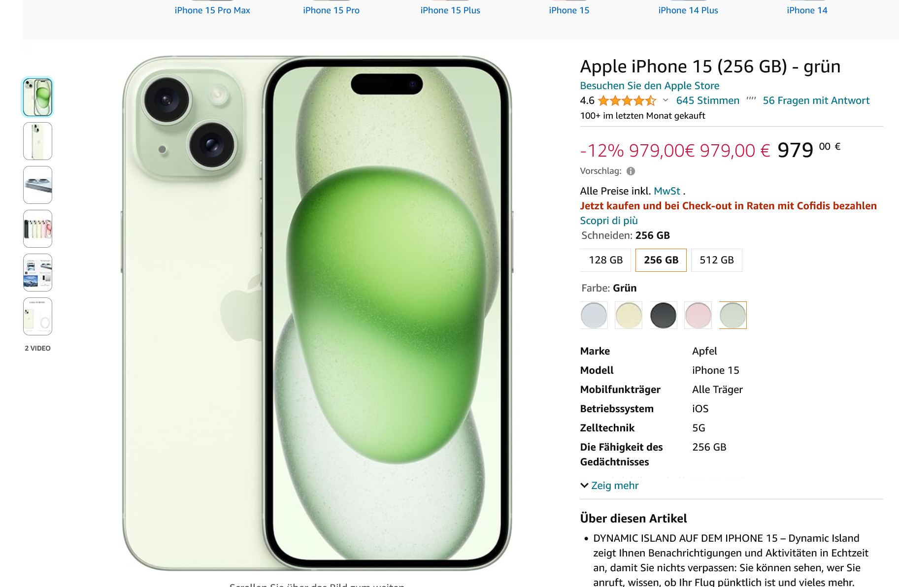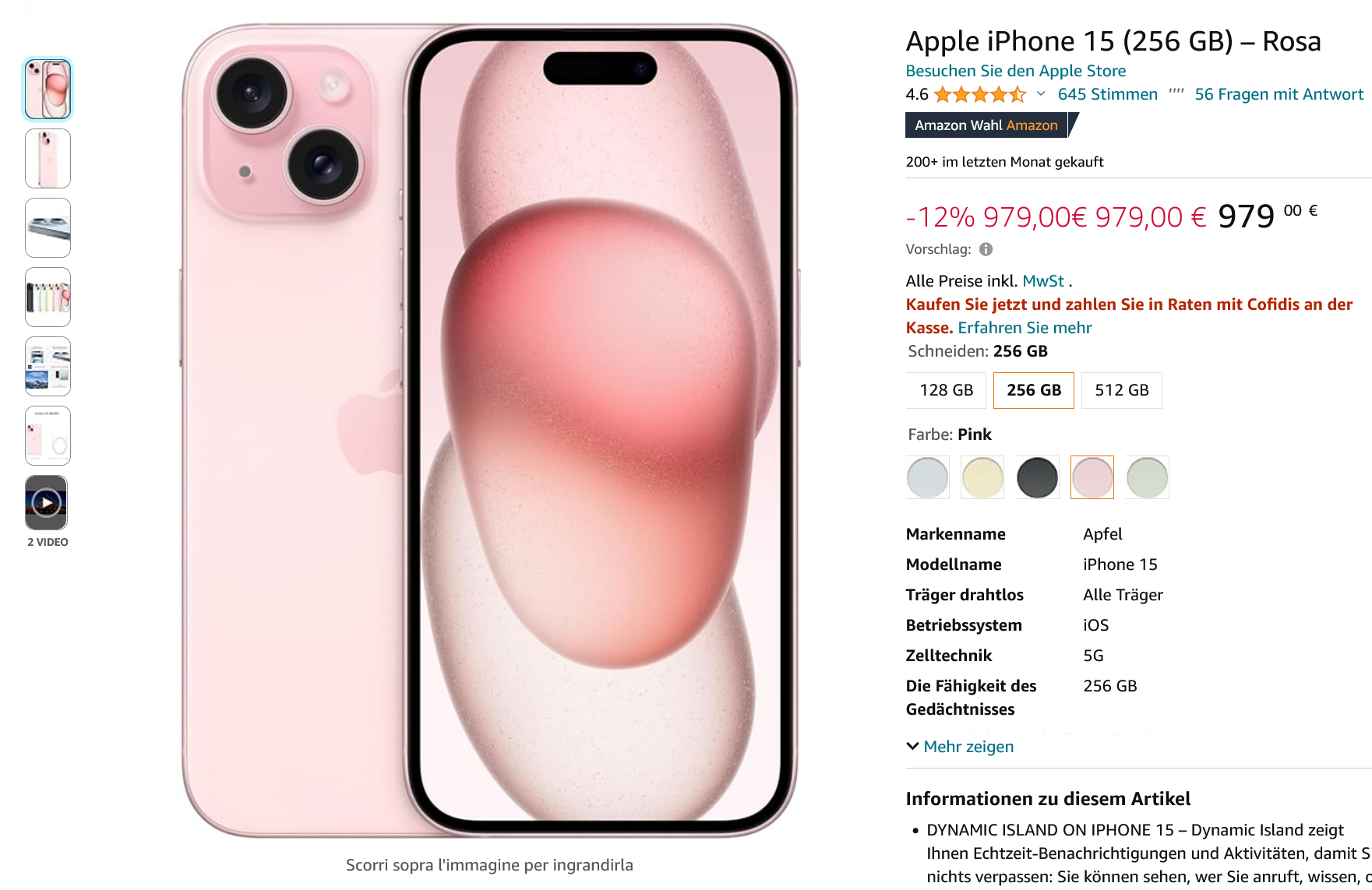 Amazon IT bietet das iPhone 15 in schwarz, pink oder grün mit 256GB für 959,25€ an.