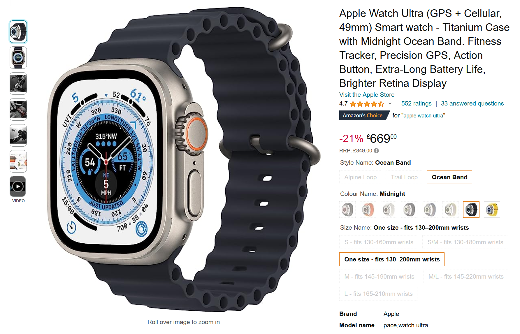 Apple Watch Ultra (GPS + Cellular, 49mm) Smart watch - Titanium Case with Midnight Ocean Band. Fitness Tracker, Precision GPS, Action Button, Extra-Long Battery Life, Brighter Retina Display : Amazon.co.uk: Electronics & Photo