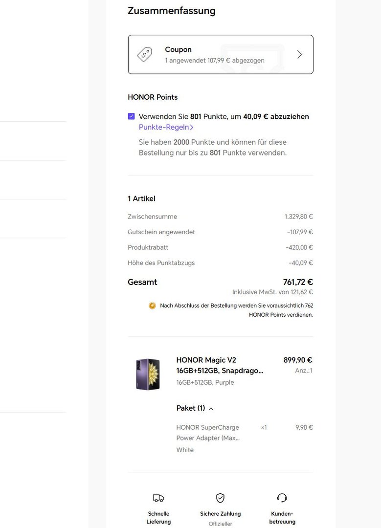 HONOR V2 mit CODE ABFEDM10 für 809,91 EUR