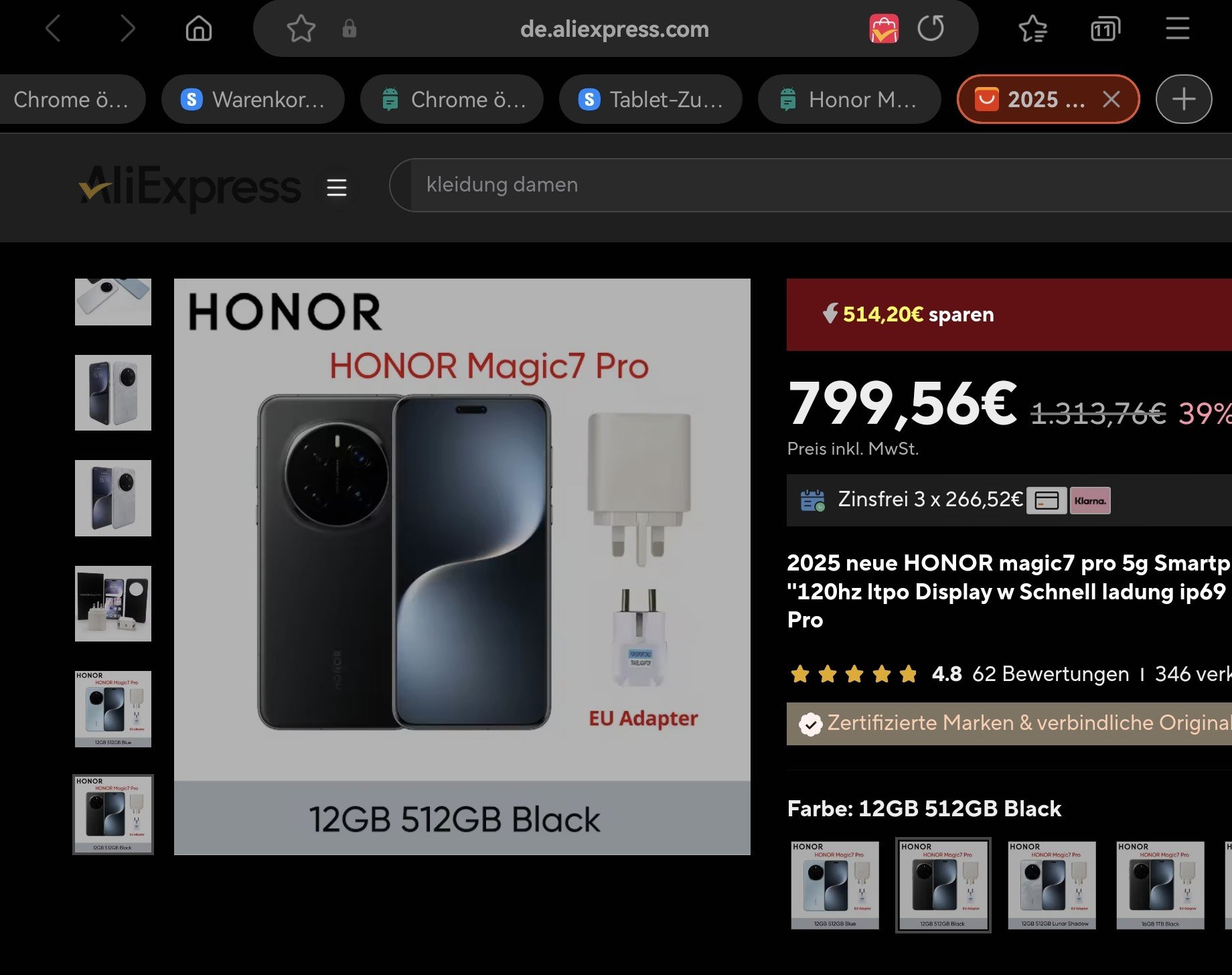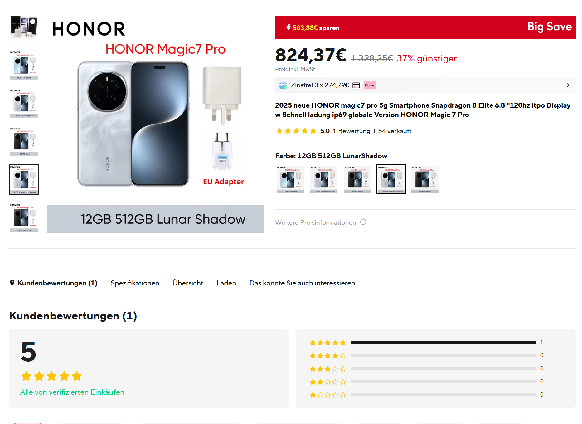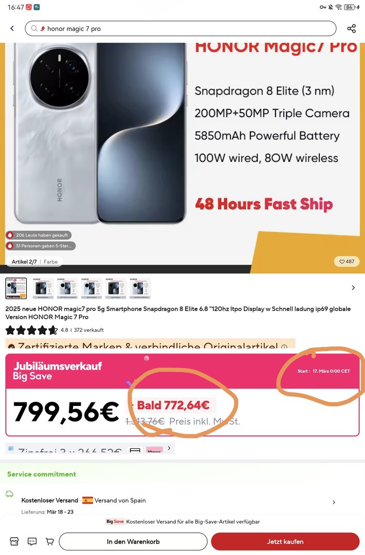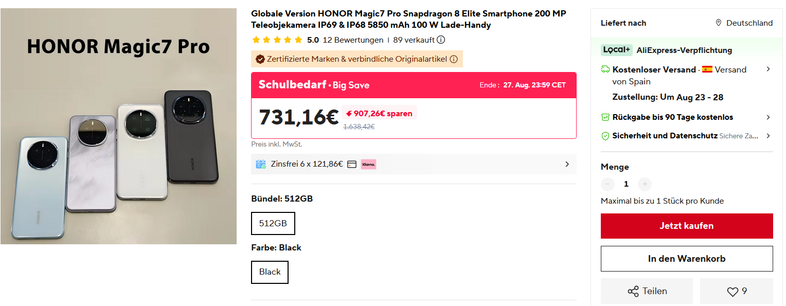 Beim Ali mit Versand aus Spanien gibt es das Honor Magic 7 Pro mit 12/512GB für 824,37€