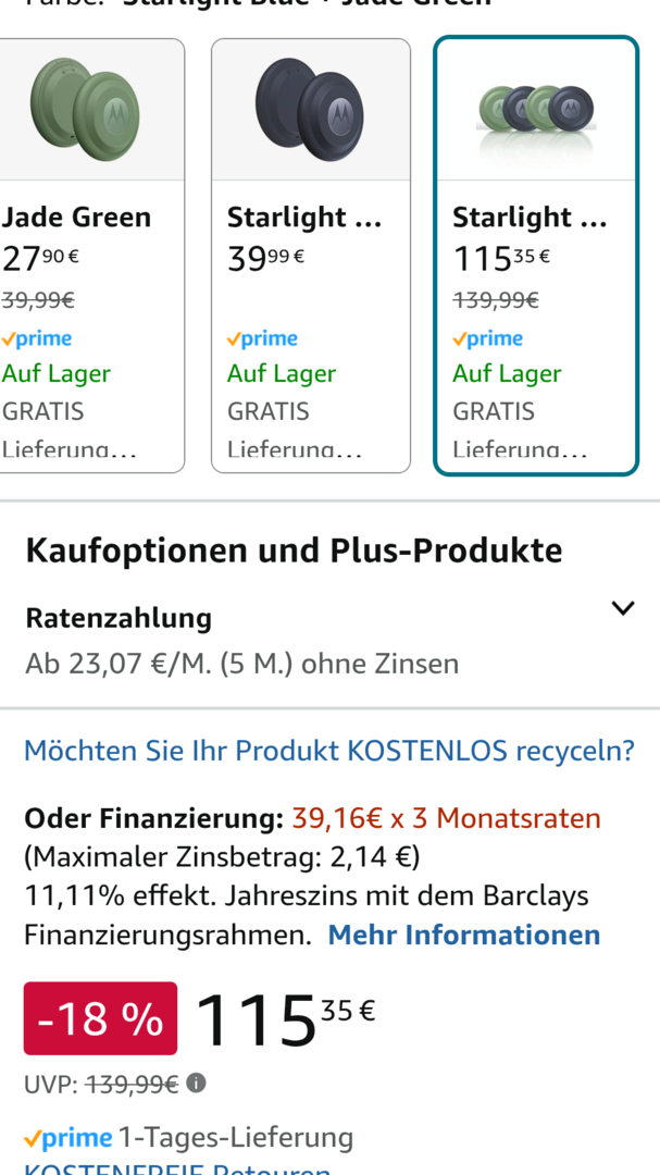 Amazon bietet aktuell den Moto Tag mit UWB in der Farbe "Jade Grün" für 27,90€ an. Die Farbe "Starlight Blau" gibt es leider weiterhin nur zum Normalpreis von 39,99€.