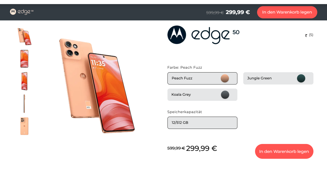 alle die überlegt hatten, beim Motorola Edge 50 Fusion zuzuschlagen, sollten nun einen weiteren Blick in den Motorola-Shop werfen. Das Motorola edge 50 ist nun ebenfalls für 299,99 EUR im Angebot (-50% Rabatt!). Das edge 50 verfügt im Gegensatz zum Fusion über eine Hauptkamera mit 50 MP, eine Ultraweitwinkelkamera mit 13 MP und eine Telefotokamera mit 10 MP und 3-fachem optischen Zoom. Zudem kann es kabellos mit bis zu 15 Watt laden.