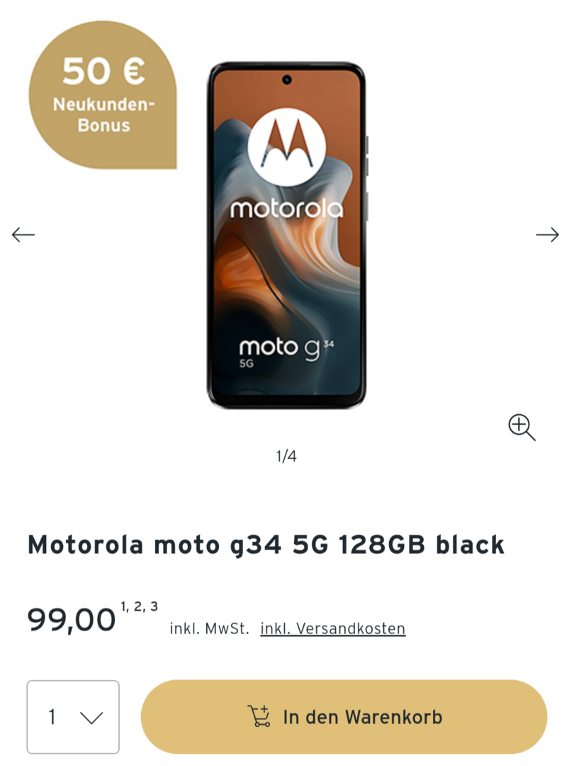 Beim Mediamarkt gibt es gerade das Moto g34 5G mit 128 GB für 99 Euro.