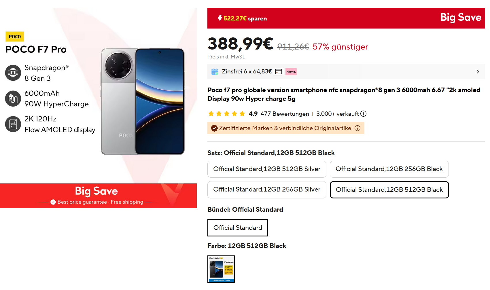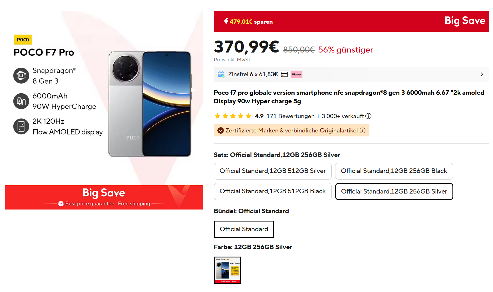 Bei ALi gibt es das Poco F7 Pro mit 12/256GB für 371€ und 12/512GB für 389€