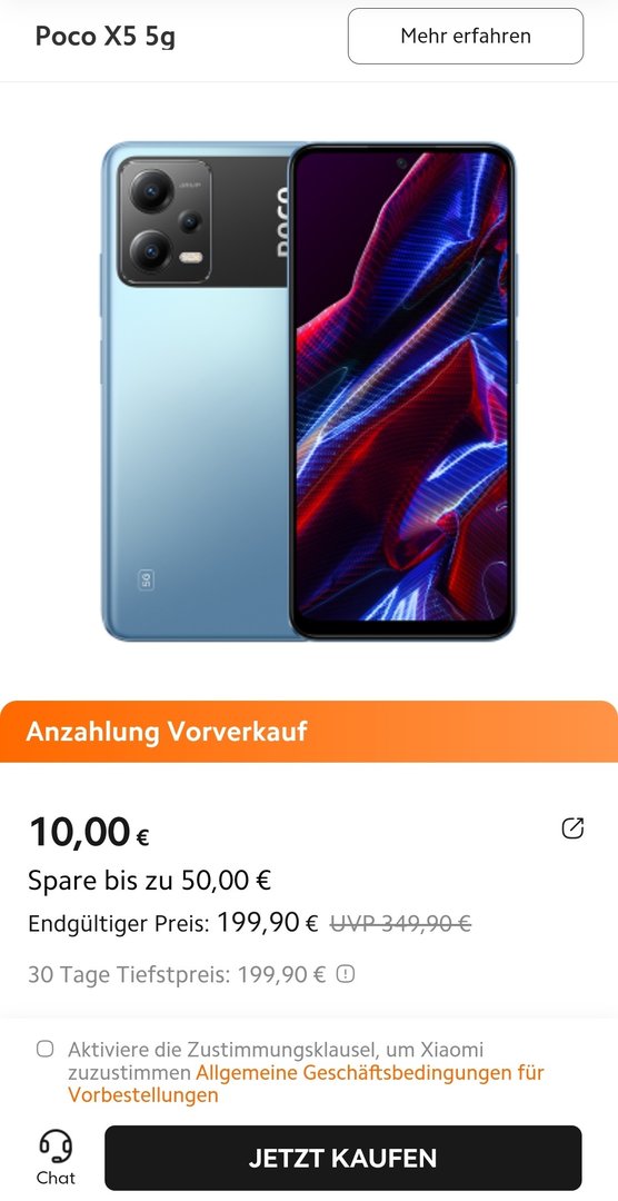 Leider nicht richtig, es ist die normale Version POCO X5 5G | Xiaomi Deutschland | Mi.comSchwammkopf schrieb:Auf der Xiaomi Seite bekommt man das Poco X5 für 199,99€ die 8GB/256GB Versionm
