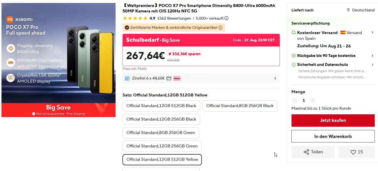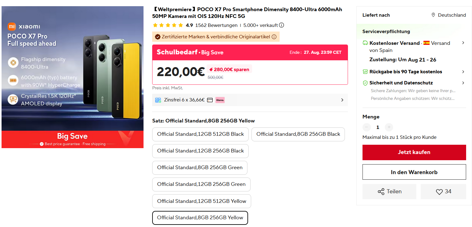 Bei Ali mit Versand aus Spanien gibt es zBsp. das Poco X7 Pro in Gelb mit 8/256GB für 220€