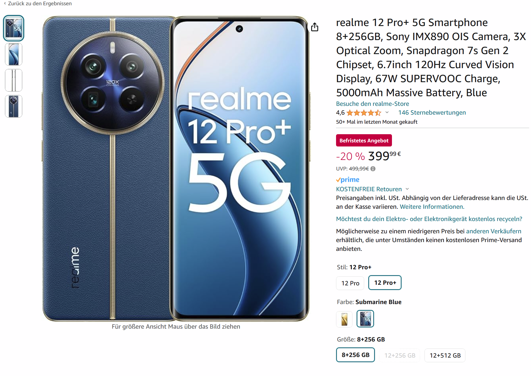 Amazon bietet das Realme 12 Pro+ in der Version 8/256GB für 399€
