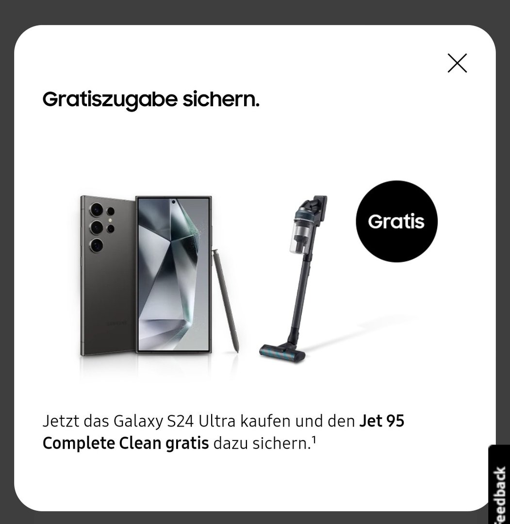 Samsung bietet seit heute eine interessante Aktion an. Zum Galaxy S24 Ultra gibt's es gratis den SAMSUNG VS20C95E4TB/WD Jet 95 CompleteClean Stielsauger dazu. Beides zusammen kostet mit den 5 Prozent Members Gutschein 1.376 Euro.