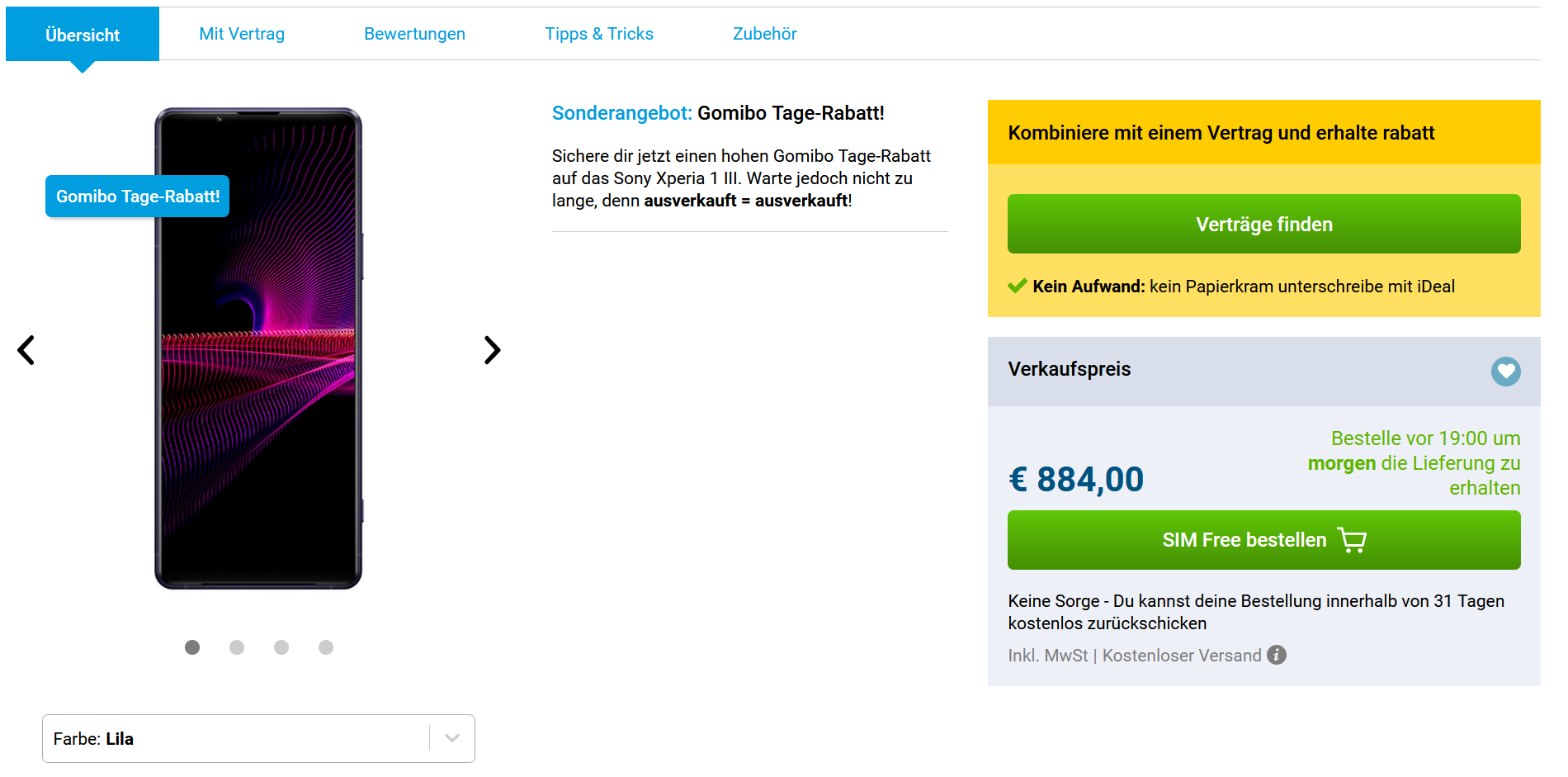 Gomibo Deutschland bietet das Xperia 1 III mit 12/256GB in Farben schwarz oder violett 884€