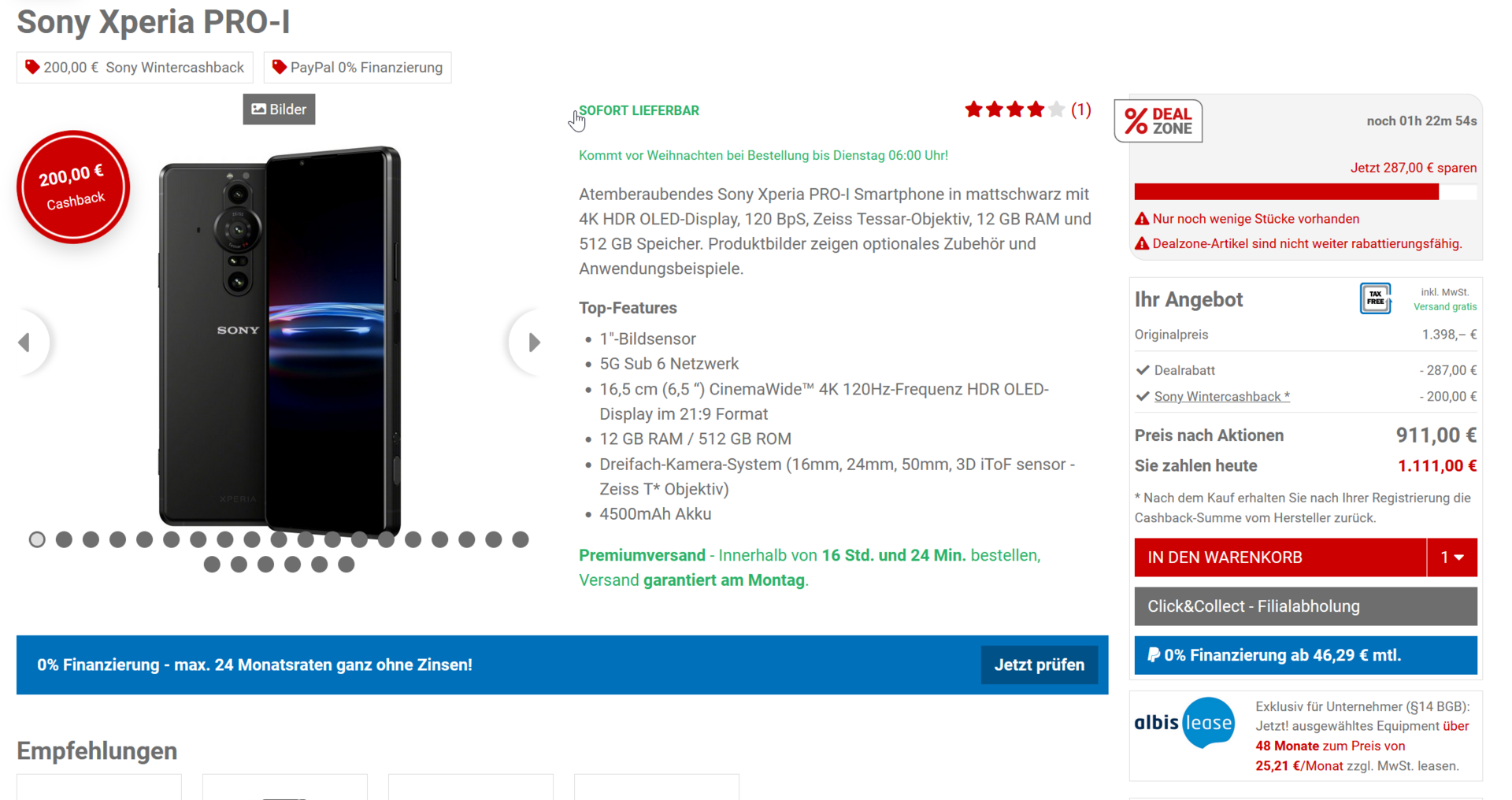 Bei Foto Erhardt gibt es das PRO-I für 1111€ nach Abzug der Cash-Back summe ergeben sich so 911€