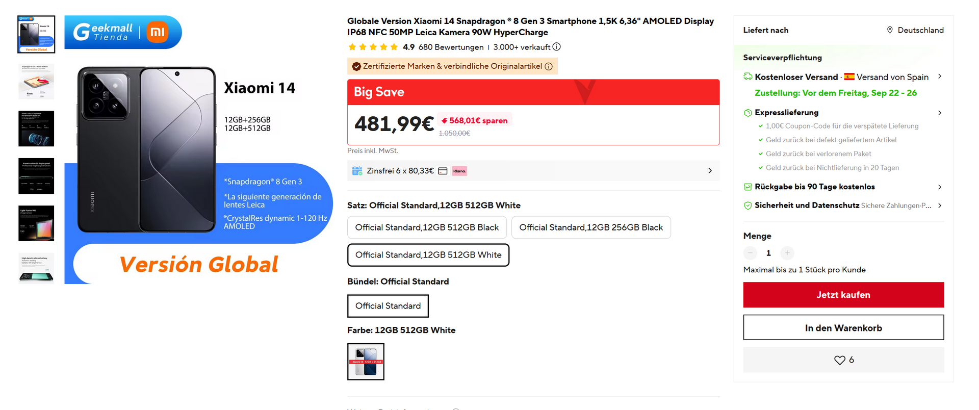 Ali Spanien bietet das Xiaomi 14 mit 12/512GB in weiß oder schwarz für 481,99€