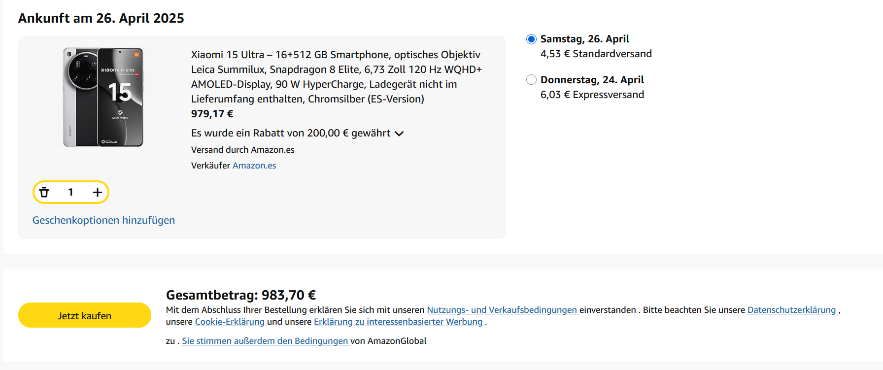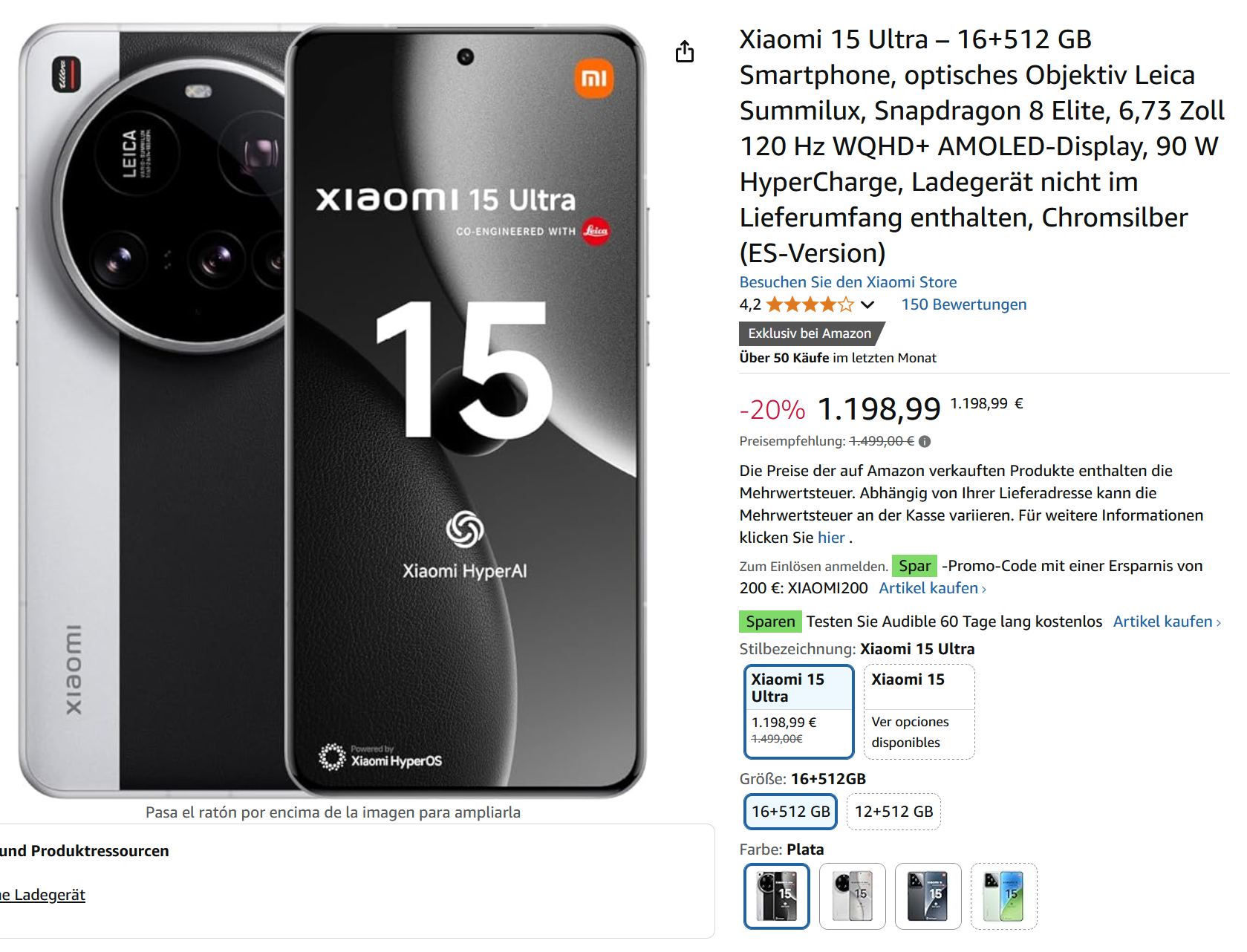 Amazon SPanien bietet das Xiaomi 15 Ultra unter Anwendung des Gutschweins XIAOMI200 für 983,70€ an!