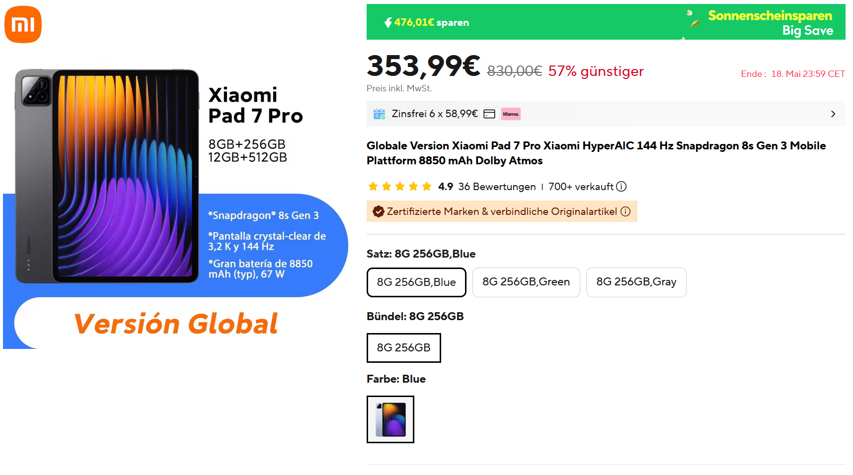 Ali bietet mit Versand aus Spanien das Xiaomi Pad 7 Pro mit 8/256GB in Blau für 353,99€