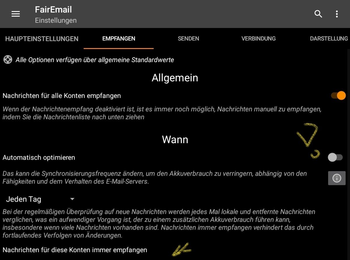Bei mir sind die in allen drei Konten angehakt (stehen alle allerdings auf imap). Meine Konten auf den *Servern* sind allerdings alle leer, da ich täglich zuhause am PC grundsätzlich per Pop3 "abräume". Von daher tut sich da nicht viel an Löschvorgängen oder Veränderungen insgesamt.Jorge64 schrieb:Noch die Frage zur Voreinstellung überprüfen ob alte Nachrichten vom Server gelöscht wurden.