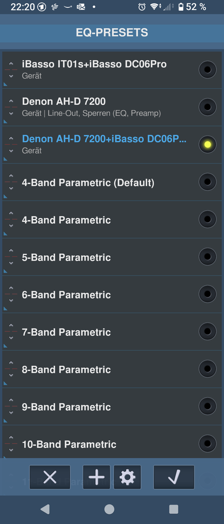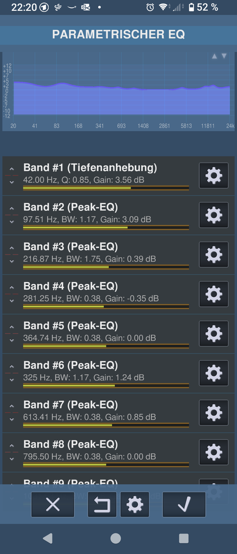 Du kannst im Neutron bis zum parametrischen 60-Band alles bis in die kleinste Kleinigkeit so konfigurieren wie Du magst. Und zwar jedes einzelne Band bis in die kleinsten Frequenveränderungen.jandroid schrieb:Noch mal eine Frage zum Neutron Player: wie kann man eine custom Equalizer-Einstellung speichern und wie viele Profile davon?